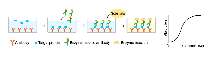 接下來,添加一種抗體(稱為第二抗體),該抗體可識(shí)別與抗原捕獲抗體所識(shí)別的表位不同的表位。我會(huì)把它留一會(huì)兒。該第二抗體預(yù)先與酶化學(xué)結(jié)合。添加的酶標(biāo)記第二抗體識(shí)別并結(jié)合與捕獲抗體結(jié)合的抗原。然后,洗去多余的酶標(biāo)二抗。接下來,添加酶的顯色底物溶液以允許酶反應(yīng)發(fā)生。顯色底物通過酶的作用轉(zhuǎn)化為色素。因此,通過添加反應(yīng)終止液來終止酶反應(yīng)后,使用96孔微孔板比色計(jì)測(cè)量染料的顯色。這樣,可以將與捕獲抗體結(jié)合的抗原的量作為染料進(jìn)行測(cè)量。比色測(cè)定的結(jié)果以吸光度表示,因此以標(biāo)準(zhǔn)品的測(cè)定結(jié)果為橫軸,以抗原濃度,縱軸為吸光度,繪制校準(zhǔn)曲線,計(jì)算出樣品中抗原的量由此。圖中所示的ELISA實(shí)現(xiàn)方法是最簡(jiǎn)單的方法。由于酶的分子量相當(dāng)大,使用該方法時(shí),用酶標(biāo)記抗體可能會(huì)對(duì)抗體的結(jié)合能力造成空間阻礙。