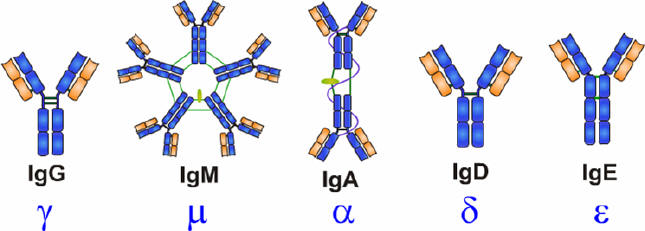 血清中有五類免疫球蛋白抗體分子:IgG、IgM、IgA、IgE和IgD。它們通過所含重鏈的類型來區(qū)分。