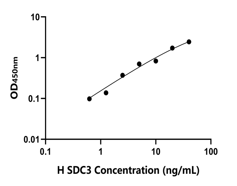 本試劑盒采用雙抗體夾心法ELISA技術(shù) : 將捕獲抗體包被于酶標(biāo)板上,捕獲樣品及標(biāo)準(zhǔn)品中的待測(cè)物SDC3,清洗后,再加入生物素標(biāo)記的檢測(cè)抗體進(jìn)行孵育后清洗,形成“捕獲抗體-抗原-檢測(cè)抗體”免疫復(fù)合物,隨后加入鏈霉親和素偶聯(lián)的辣根過氧化物酶進(jìn)行孵育,待孵育結(jié)束后清洗,接著加入TMB顯色后,若樣本中有待測(cè)物則顯藍(lán)色,加入終止液停止反應(yīng)。檢測(cè)過程中游離的成分均被洗去,用酶標(biāo)儀在450 nm處測(cè)OD值,顏色的深淺和樣品中的待測(cè)物的含量呈正比,通過繪制標(biāo)準(zhǔn)曲線計(jì)算出樣本中SDC3的濃度。