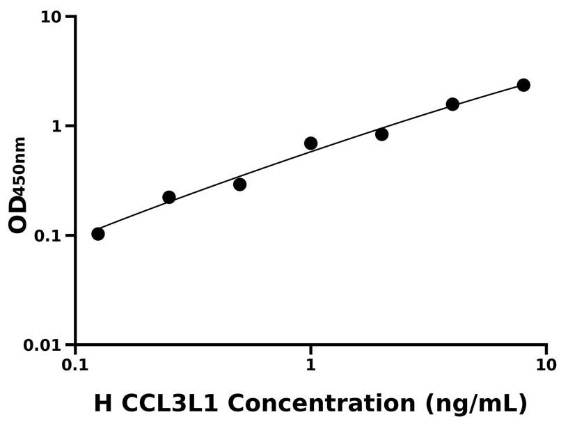 本試劑盒采用雙抗體夾心法ELISA技術(shù) : 將捕獲抗體包被于酶標(biāo)板上,捕獲樣品及標(biāo)準(zhǔn)品中的待測(cè)物CCL3L1,清洗后,再加入生物素標(biāo)記的檢測(cè)抗體進(jìn)行孵育后清洗,形成“捕獲抗體-抗原-檢測(cè)抗體”免疫復(fù)合物,隨后加入鏈霉親和素偶聯(lián)的辣根過(guò)氧化物酶進(jìn)行孵育,待孵育結(jié)束后清洗,接著加入TMB顯色后,若樣本中有待測(cè)物則顯藍(lán)色,加入終止液停止反應(yīng)。檢測(cè)過(guò)程中游離的成分均被洗去,用酶標(biāo)儀在450 nm處測(cè)OD值,顏色的深淺和樣品中的待測(cè)物的含量呈正比,通過(guò)繪制標(biāo)準(zhǔn)曲線計(jì)算出樣本中CCL3L1的濃度。